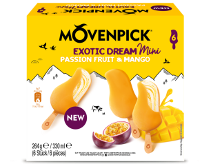Fans of our Mövenpick Passion Fruit & Mango stick will love to spoon this ice cream. A delicious harmony of creamy panna ice cream, refreshing passion fruit and sweet mango.